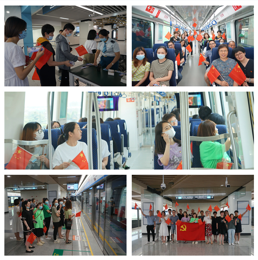 下午1:20,黨員職工們在大廈底樓集合,一起興高采烈出發(fā)至皮革城站入口,換票、安檢、檢票進站后,踏上了杭海城際鐵路的試乘旅途。大家手舉小紅旗,激動之情溢于言表。