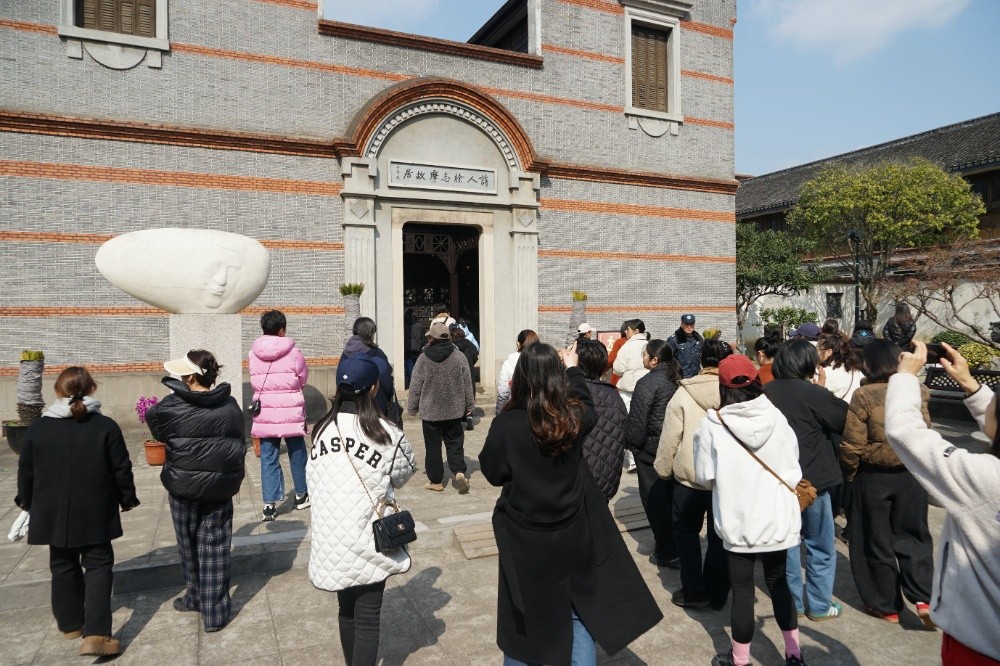 步履輕盈如行云流水,魅力綻放似春風拂柳。下午1點半,大家相約在中絲三廠文創園集合,隨后沿著塘河一路往北,來到干河街歷史街區,參觀徐志摩故居。
